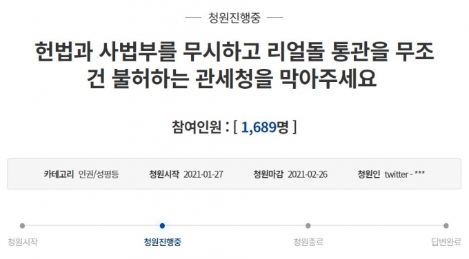 리얼돌 국민청원 : 리ì¼ëì ìë물 ìë ì±ê¸°êµ¬ íê²°ìë ë ¼ë ê³ìëë ì´ì 머ëí¬ë°ì´ / 지난 8일 청와대 국민청원 게시판에 올라온 '리얼돌 수입 및 판매를 금지해주세요'라는 제목의 글은 이날 오전 8시경 20만 동의를 넘었다.